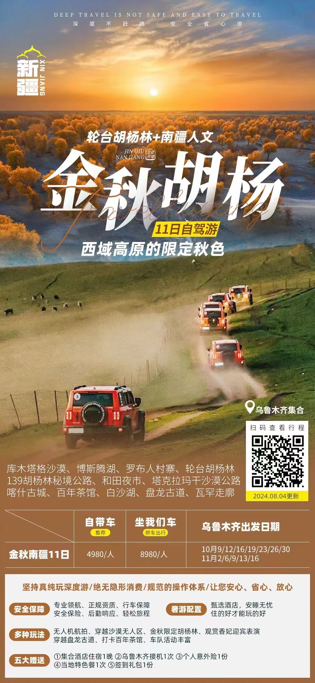 秋景南疆金秋胡杨林11日自驾:库木塔格沙漠-轮台胡杨林-139秘境公路-沙漠公路-喀什古城-白沙湖-