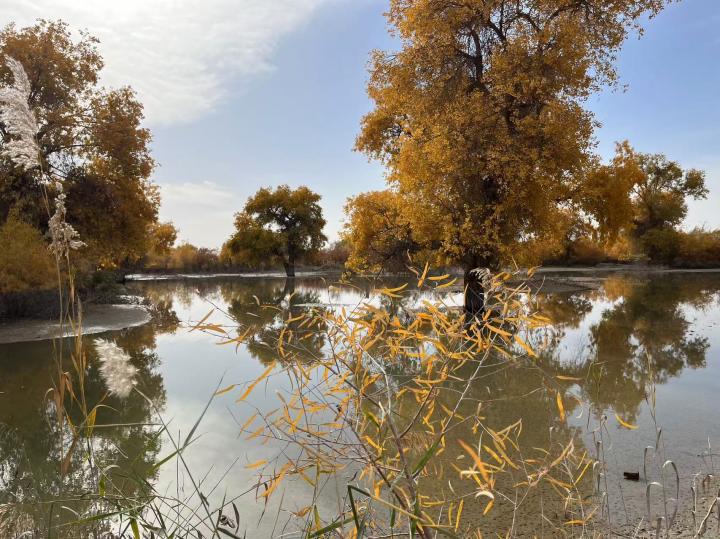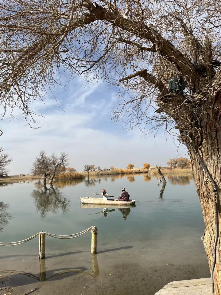 10月28日领队现场拍到照片,在罗布人村寨和罗布人划着小木船,在胡杨林中慢慢欣赏秋色,平静祥和,一切都刚刚好。