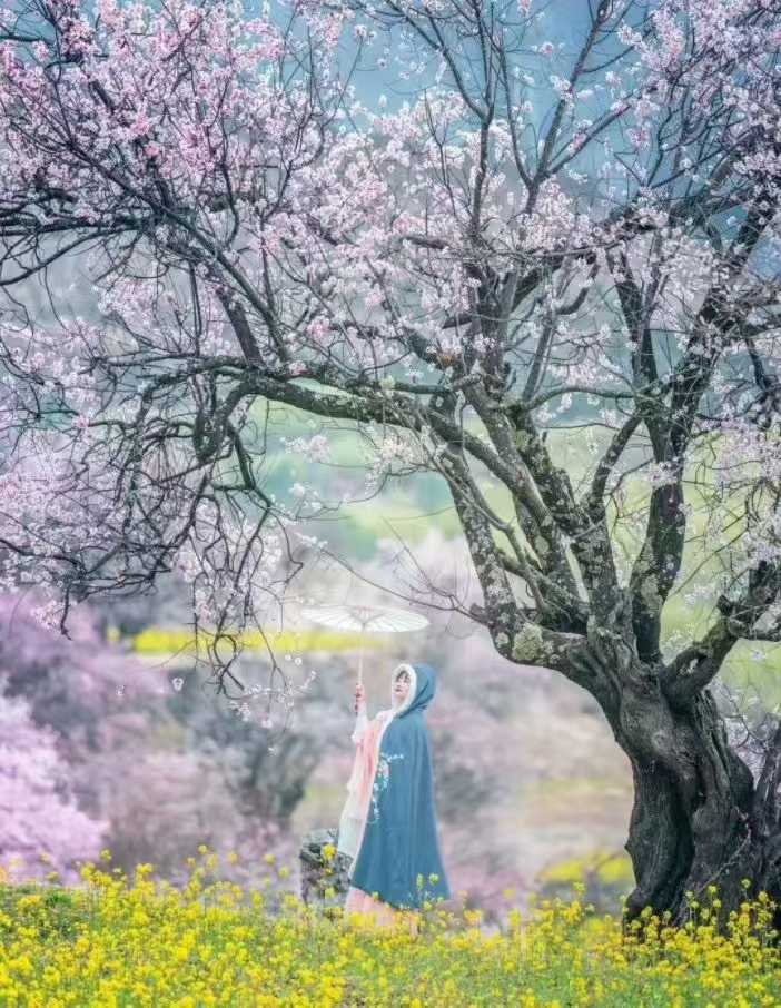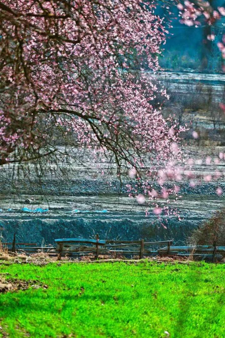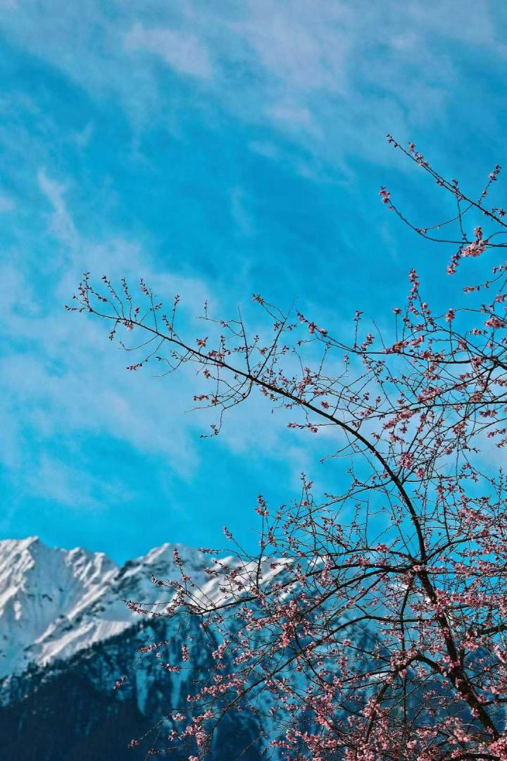 雪山为盟,桃花为约,在索松村邂逅藏地春天,百年野桃肆意绽放,日照金山时,花瓣都染上了金色光晕。