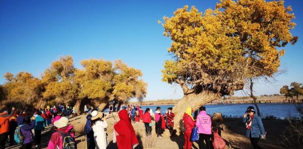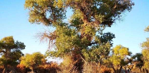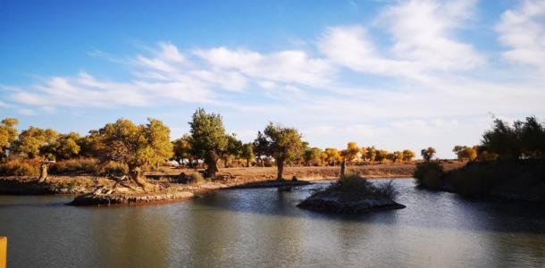 金塔胡杨林位于甘肃省酒泉市金塔县城以西的潮湖林场,那里有着上万亩人造胡杨林,周边分布大面积的沙枣树、白杨、红柳等大西北特有的树种,该胡杨林分布密集,长势良好,规模居全省之冠,金秋十月的胡杨,绿色的树叶有的已经变黄