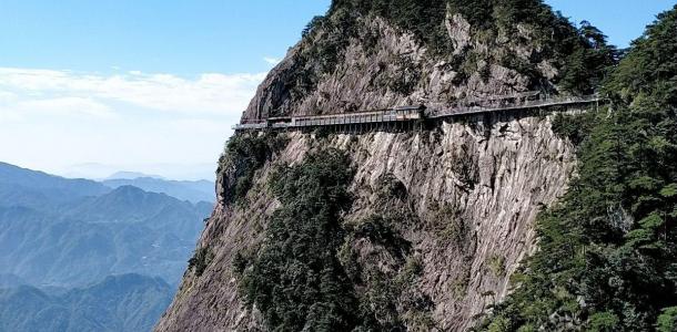 明堂山高空栈道由绝壁栈道、玻璃栈道、玻璃屋、玻璃眺望台及玻璃桥构成,总长1300米,宽1.5米至2米,落差达400米。沿崖壁修建,环绕主峰景区(天子峰、神女峰、圣母峰)一周,形成“四面看景”的独特风光。被誉为“华东第一玻璃栈道”。
