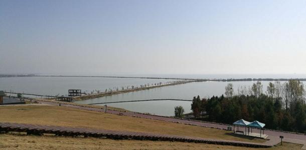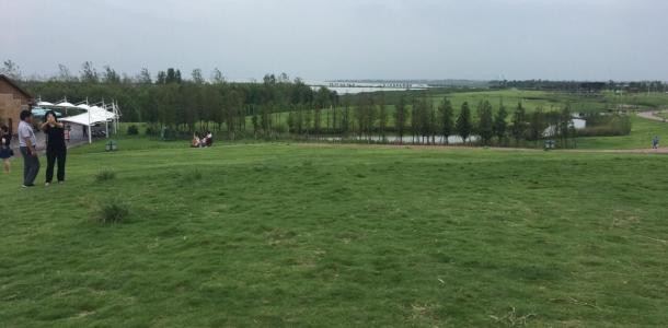 岸上草原位于合肥市庐州大道与环湖北路交口以南的沿湖地带,草原上有7座小山丘,草原中还有两个内湖,内湖四周已经撒上了多个种类的花草种子,待花草繁茂时,草原将会平添更多风韵。站在其中一座小山丘上远眺,记者看到了渡江战役