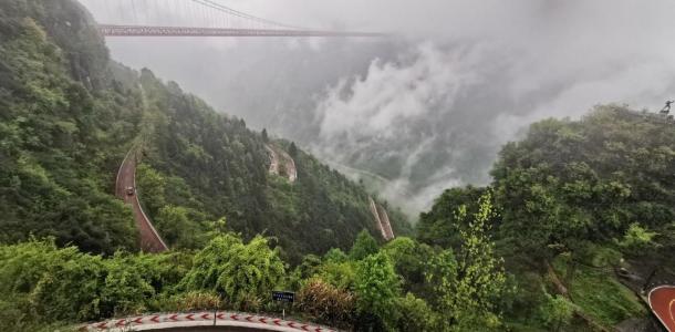 矮寨特大悬索桥位于湖南省湘西州吉首市矮寨镇境内,桥型方案为钢桁加劲梁单跨悬索桥,全长1073.65m,悬索桥的主跨为1176m,创造了四项世界第一。