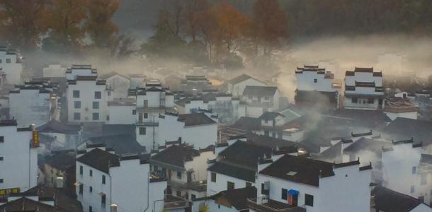 秋天的石城,慵懒而又美艳。尤其是每天清晨,村子里的居民做早饭而产生的缕缕炊烟,凝聚在晨雾中,聚而不散,萦绕在古村落之间,使这充满古徽州建筑特色的程村若隐若现,有如置身于天上人间般的虚幻缥缈之中。等到阳光喷薄而出,