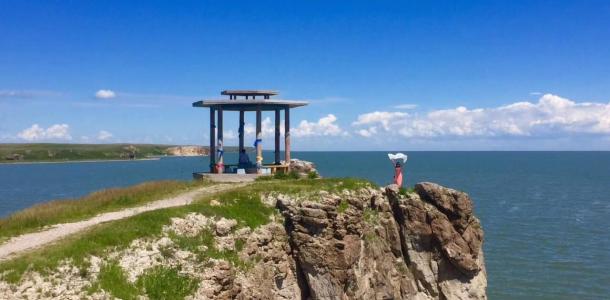 成吉思汗拴马桩位于呼伦湖西岸,是一处三面环水的峭壁。南临一湖碧水,石壁嶙峋峭拔,光滑如刀削;北、东面呈陡坡,下临湖湾;只有西部为缓坡与湖岸相连。山顶上有一座凉亭,山崖东方10余米的湖水里,有一座高10米左右、周长20余米