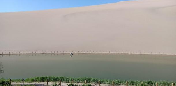 月牙泉,古称沙井,俗名药泉,在城南7公里鸣沙山北麓。自汉朝起即为“敦煌八景”之一,得名“月泉晓澈”。月牙泉南北长近100米,东西宽约25米,泉水东深西浅,最深处约5米,弯曲如新月,因而得名,有“沙漠第一泉”之称。月牙泉泉形