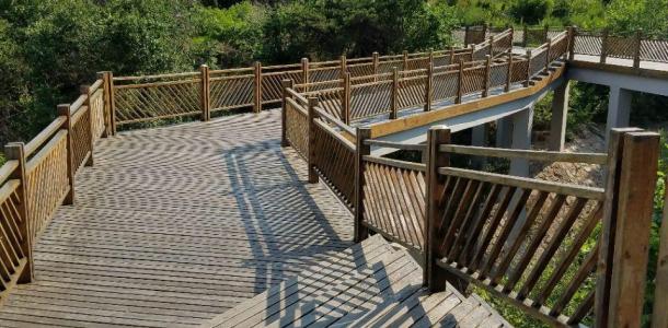兴海栈道全长1600米,东起龙回头广场,南至邴家湾,沿途一边为大海,一边为山地森林。栈道建有木桥、索桥、下沉式谷地、观海长廊、凉亭和休闲广场等多类景观,将具有鲜明反差的两侧天然景观串联起来。