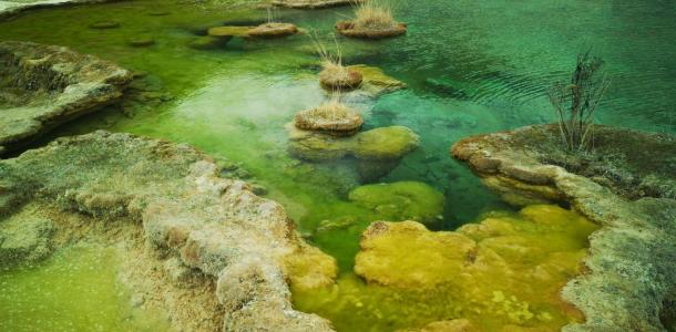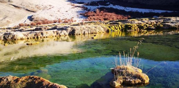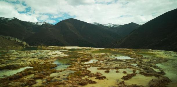 泉华滩海拔约4000米,属于高山河谷草甸地貌。东南面是贡嘎山,在泉华滩观看蜀山之王之称的贡嘎山是绝佳的位置。泉华滩因一种含有大量化学物质的泉水在地表产生化学沉淀而成,长达900多米,宽100余米,依山而下形成8个泉华阶地。每个阶