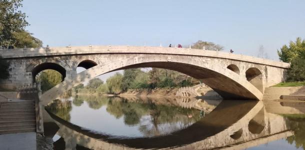 赵州桥又称安济桥,坐落在河北省赵县的洨河上,横跨在37米多宽的河面上,因桥体全部用石料建成,当地称做“大石桥”。建于隋朝开皇十一年至开皇十九年(公元591年-599年)之间,由著名匠师李春设计建造,距今已有1400多年的历史,是