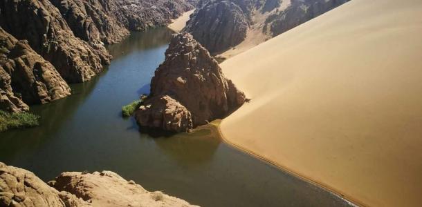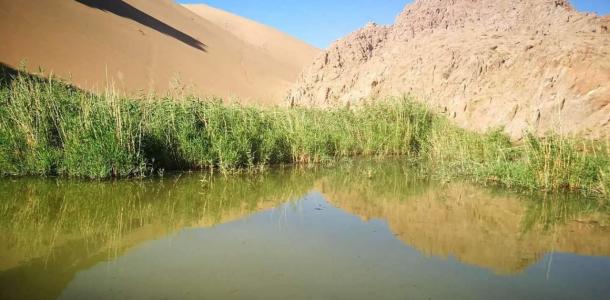 阿拉善大漠天池位于内蒙古自治区阿拉善盟阿右旗境内,是藏身于巴丹吉林沙漠中罕见的一处沙漠堰塞湖,据说这样的堰塞湖在全球也是罕见的,当地人称它为“岗根淖尔”。褐色的花岗岩山如同一道屏障阻挡了细密黄沙的移动,碧水、黄沙