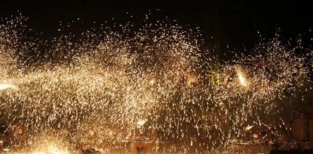司徒小镇的千余人打铁花团队,是中国历史上的首次打铁花豪华阵容。夜幕降临时,千人赤膊上阵同时打铁花,炉火正旺、铁水火红,汗水混合着铁水,朵朵铁花如天女散花,绚丽夺目,夜空之下,火星璀璨,犹如天女散花。