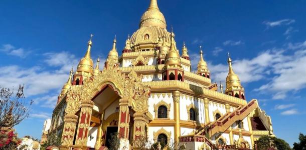 勐焕大金塔座落在云南省德宏州州府-芒市东南部孔雀湖畔的雷牙让山顶。青山绿水间的“勐焕大金塔”光彩夺目,金光灿灿,显得雄伟壮观,是芒市标志性的建筑,也是生活在这里的傣族人民的圣地。传说“释加牟尼”生前转世为金鸡时曾生