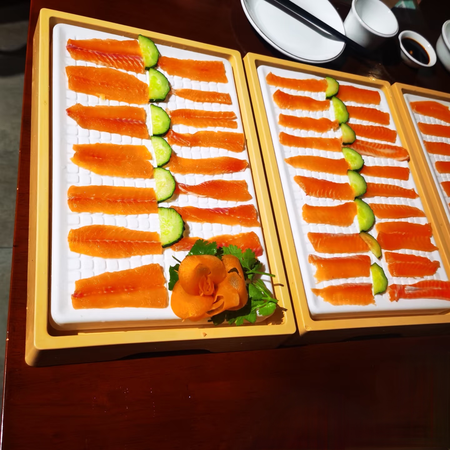 稍作休息,晚餐带领大家品尝东江湖特色三文鱼宴。