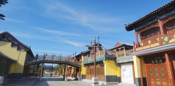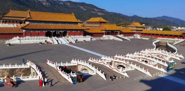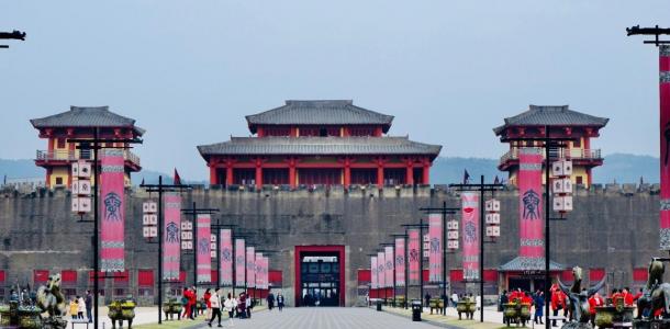 横店影视城秦王宫景区是1997年为著名导演陈凯歌拍摄历史巨片《荆轲刺秦王》而建。有雄伟壮观的王宫宝殿27座,主宫“四海归一殿”高达44.8米,面积17169平方米。建筑面积6000平方米的“秦汉街”,充分展示了秦汉时期的街肆风貌。黄尘古道