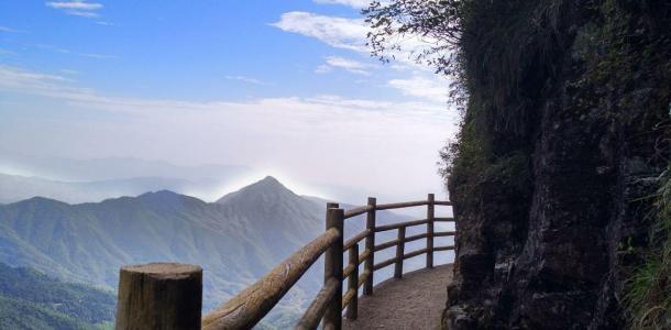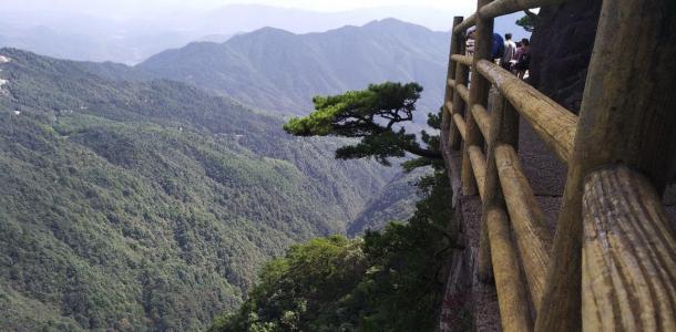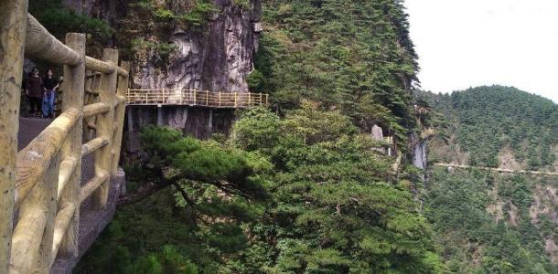 【青云栈道】位于明月山山顶海拔1700米处,起于梦月山庄,悬空的栈道横亘于悬崖峭壁上,如盘云的游龙。迎客松及各类灌木点缀左右,形态万千,常年云雾缭绕,行走其上,有平步青云之感。故名青云栈道。
