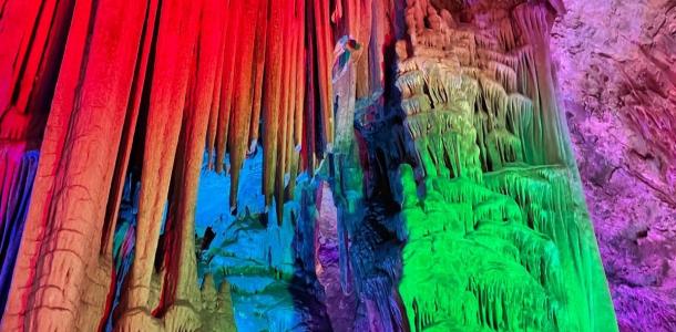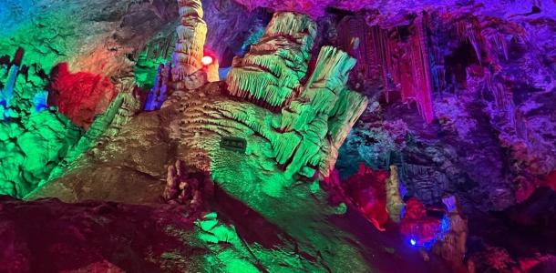 风洞是一个厅堂和廊道间隔出现的溶洞,它和佛爷洞、天洞风格迥异,其厅堂比佛爷洞宏伟广阔,其廊道比天洞沉长艰险。洞内景观玲珑诡异,色彩斑斓。