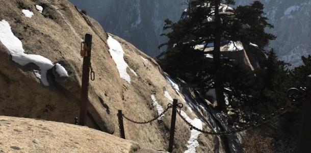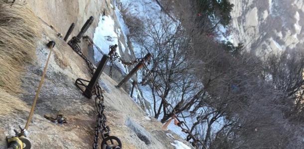 华山北峰苍龙岭是华山著名险道之一,莽莽苍苍,岭呈苍黑色,笔直插天,好像苍龙腾空。此岭上的台阶只有2尺多宽,两旁万丈深壑,势陡如刀削斧劈。岭脊上下高差约500米,坡度在45度以上。在这里遥望青松白云,耳听风声大作,令人心惊