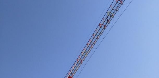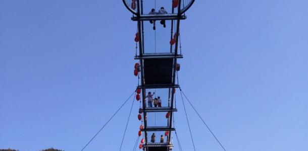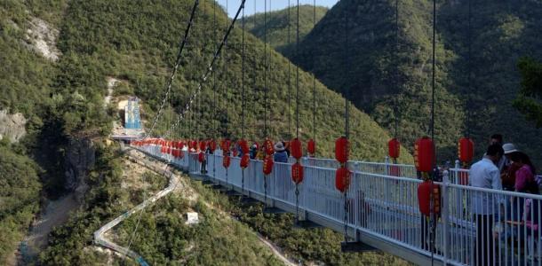 五龙河玻璃桥悬于天梦湖两侧山峰之间,两峰地势险峻,悬壁陡直,中间五龙河河水横穿!玻璃桥长约300米,垂直高度达180米,是目前省内跨度最大和垂直高度最高的玻璃桥!