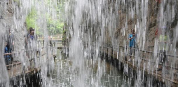 水帘洞宽150米,高15米,堪称华夏第一水帘洞。钻水帘洞,看洞中有洞,帘中有帘,别有一番景致。这个水帘洞是天然形成的,它过去是一个溶洞,据说还做过闯王夫人的议事厅呢,经过上百年的流水冲蚀,形成了现在这样的形状。