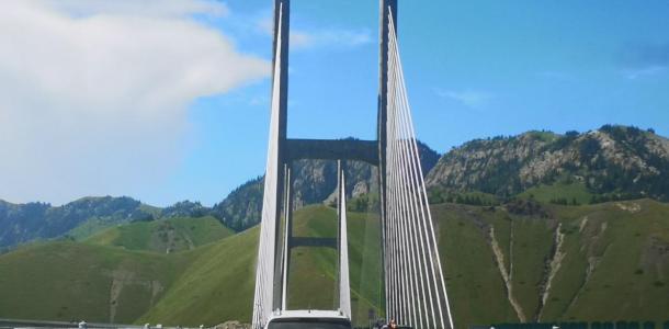 果子沟大桥全称果子沟双塔双索面钢桁梁斜拉桥,全长700米,桥面距谷底净高达200米,是国内第一座公路双塔双索面钢桁梁斜拉桥,也是新疆第一高桥。