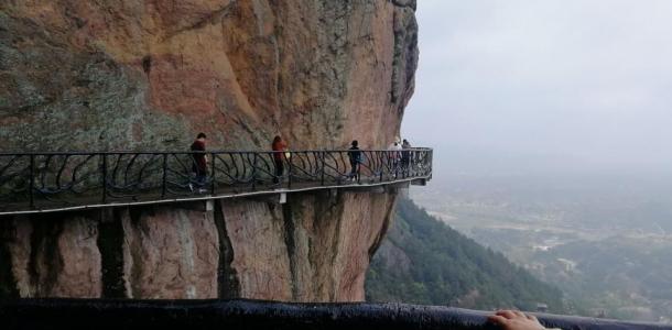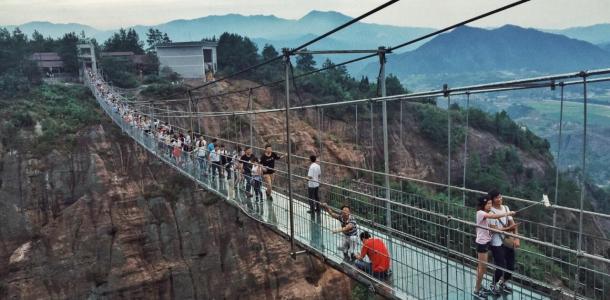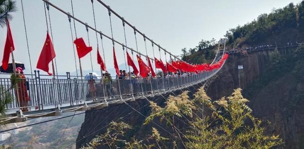石牛寨玻璃桥,也称为“好汉桥”,长约300米,垂直高度达180米,相当于四五十层楼房的高度,历经四年的构思与两年艰苦工程的改造于2015年国庆前夕正式对游客开放,是国内首座高空全透明玻璃桥,也是目前国内跨度最大,垂直高度最高的