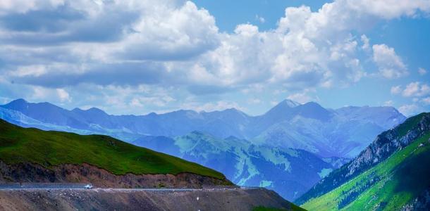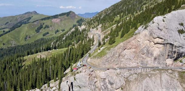 伊昭公路是古代丝绸之路“弓月道”的其中一段,其道路险峻异常,行走其间仿佛穿行在白云之上,公路傍河而建,路边是缓缓的绿色的山坡。全长180公里,北起伊犁哈萨克自治州的昭苏县的夏特牧场,南至阿克苏地区温宿县的破城子的夏特