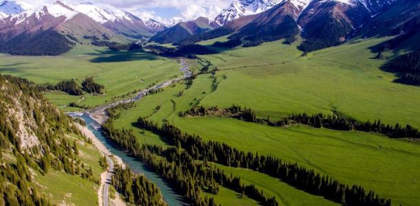 这段路里蓝天、白云、绿草茵茵、流泉滚滚、溪水淙淙,云衫密林、苍翠挺拔,冰峰雪岭倒影水中,喀什河流横贯全境,一步一景,如诗如画,美不胜收。