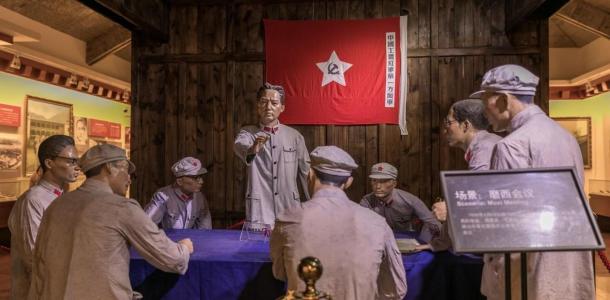 磨西红军长征纪念馆坐落于摩西古镇的中心,总面积约800平方米。1935年5月,毛泽东同志带领红一方面军自石棉什月坪到达磨西,夜宿磨西天主教堂,在此召开了著名的“磨西会议”。纪念馆以该史实为依据,分上、中、下三层展厅共计四个单
