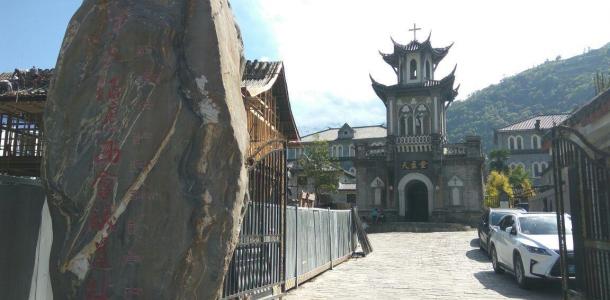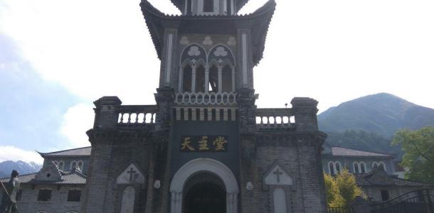 磨西天主教堂是一座欧式风格的标志性建筑。1892年左右,法籍传教士彭某在丹巴传教遇害,获赔白银2000两,其弟弟用这笔赔银在磨西置地,1918年彭主持修建磨西天主教堂,1922年完成神甫座房,1926年钟楼、经堂落成。1935年红军长征路过此地