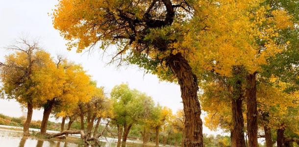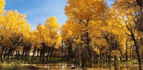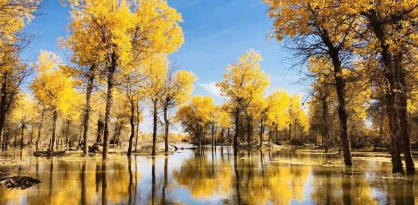 二道桥又称倒影林,胡杨在河的两岸耸立起来,被河水折射出倒影,给人如诗如画的写意景象。二道桥的胡杨林风景最好,因为二道桥的胡杨林都在水边,倒影在水中的胡杨别有一番景象,蓝天白云与金色胡杨映在水中,分辨不出哪儿是天哪