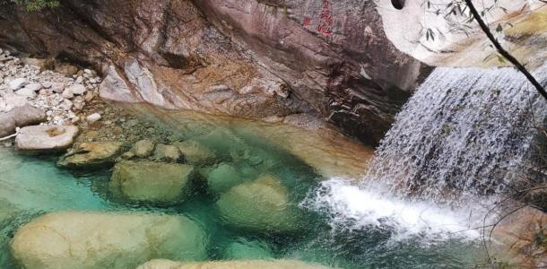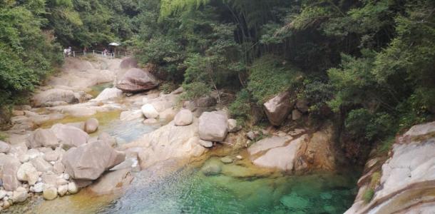 翡翠谷景区在黄山的东部,又称“情人谷”,谷中之水源出炼丹峰、始信峰,游人可至的景区有6000米长,峡谷中分布着大小彩池数百个,有40余个彩池的面积超过100平方米,最大的彩池面积近1000平方米。