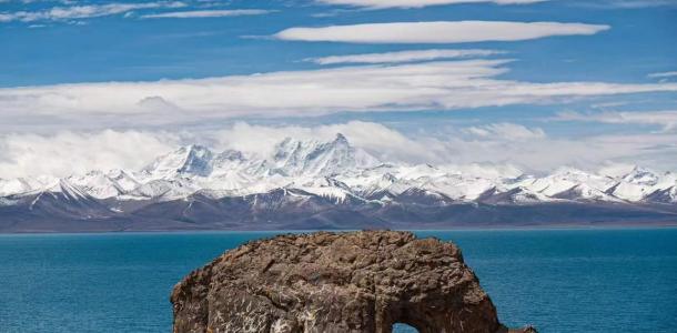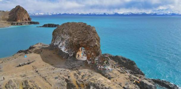 圣象天门位于西藏那曲地区班戈县青龙乡5村境内,圣湖纳木措北部恰多朗卡岛上。圣象天门,因这里的湖边有一座形似大象汲水的小山而得名。山上远远的看去纳木错的湖岸线形成了两个完美的弧形,弧形的中间突兀耸立着一块巨石,近看像