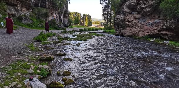 郭莽湿地放眼望去:无垠的草原,天高山远,水草丰美;弯曲的河流,纵横交错,九曲回转;漫山遍野的小花,姹紫嫣红,争相怒放。随后前往纳摩大峡谷,去探索白龙江源头,刚刚走入峡谷,两边峭壁高耸,道路狭窄,之后就有步入桃花源的感觉,复行数十步,则豁然开朗。顺着溪流而上,无比清澈的泉水从谷底的碎石和侧面的石壁中汩汩流出,汇集成白龙江最初的模样。