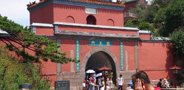 南天门位于泰山十八盘的尽头,是登山盘道顶端,此处双峰夹峙,仿佛天门自开。由下仰视犹如天上宫阙,所以取仙境场所命名。穿过南天门就是泰山山顶,登山行程正式完成.南天门分上下两层。下层为拱形门洞,上镶石匾额“南天门”,两