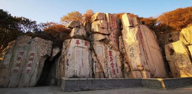 “五岳独尊”景观石群,位于泰山极顶玉皇庙东南,海拔1545米。历经百年沧桑的“五岳独尊”四个字是正楷书体,系清光绪丁未年间(公元1907)年由玉构题书,摩崖高210厘米,宽65厘米,大字径55x42厘米。在其左侧有楷书“昂头天外”题刻。“五