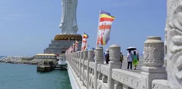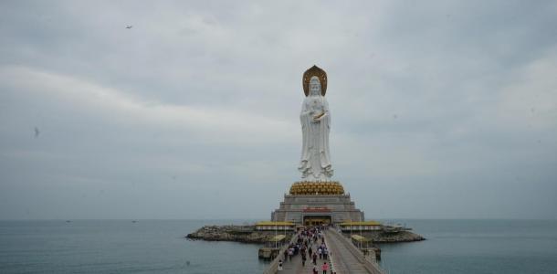 南山海上观音是座108米高的观音菩萨圣像,位于南山寺前的海上金刚洲(观音岛)上,其圣象为正观音的一体化三尊造型,脚踏一百零八瓣莲花宝座,宝相庄严雄伟。海上观音是三亚著名的佛教建筑,也是著名的祈福胜地。海上观音的莲花座