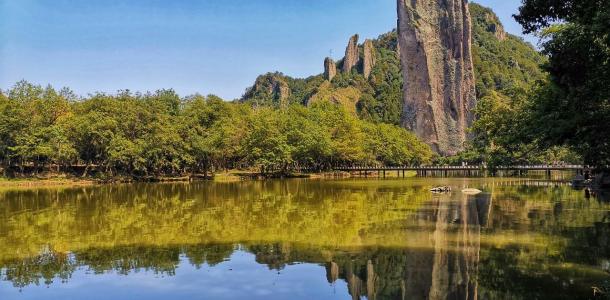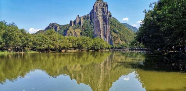仙都鼎湖峰是缙云县仙都风景名胜区的核心,状如春笋,直刺云天,高170.8米,是《仙剑奇侠传》《神雕侠侣》《花千骨》《道士下山》等众多影视作品的拍摄地。这里堪称“天下第一峰”“天下第一笋”,峰巅苍松翠柏间蓄水成池,四时不竭