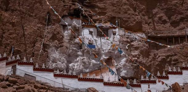 古入江寺也称也称古如江寺、古如甲寺,是阿里境内唯一的苯教寺庙,坐落在象雄琼钦崩巴山,这里有西藏历史上最早的修行洞“雍仲仁钦洞”,距今已有2900多年的历史。寺院占地面积很大,侧面的直立山崖上有许多修行洞,经幡从山顶、山