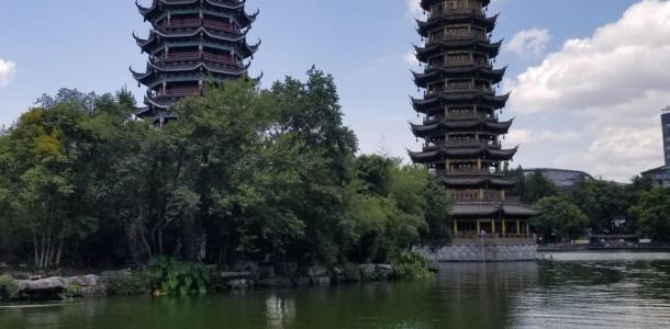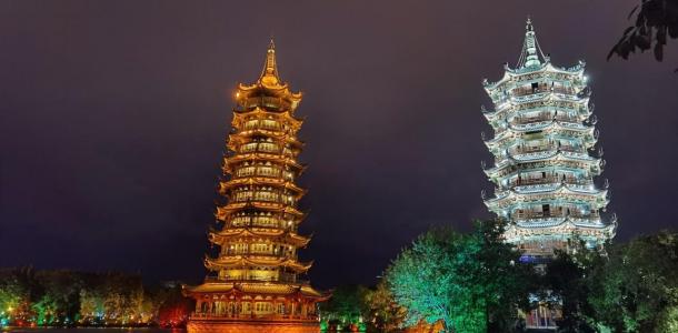日月双塔是坐落于桂林市中心杉湖中的两座宝塔,日塔为铜塔,月塔为琉璃塔,两塔之间以湖底一条10多米长的湖底隧道相连。每到夜晚,两座塔在灯光映衬下分别散发着金银两色光芒,倒影在湖中的景象格外漂亮。