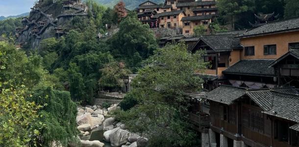 独特的叠水景观—【三叠水】前方的峡谷是两条溪交汇的地方,峡谷里的水自上流下,遇上了高高低低、长长短短的石阶,就产生了形式不同、水量不同、水声各异的叠水景观。