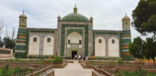 香妃园(香妃墓)位于喀什市东郊5公里处的浩罕村,原名为阿帕克霍加麻扎,是新疆较有名的伊斯兰教圣裔家族的陵墓,后来因传说乾隆皇帝的香妃埋葬于此,于是香妃墓的名字被渐渐传开,取代了原名。事实上这里是一大家族五代72人的陵墓群,香妃墓只是其中之一。