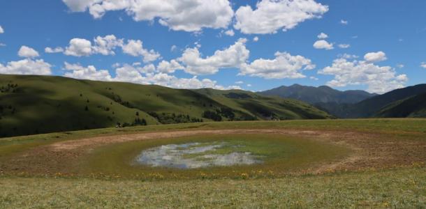 格聂之眼位于下则通村子15分钟的距离,它属于天然形成的大坑,从高空中俯瞰,仿似一只大眼睛,所以名为格聂之眼。格聂之眼就像大地的一只眼睛,倒映着蓝天白云,清澈明亮。“格聂之眼”是观赏格聂群峰的最佳位置,眼前草甸平坦开阔