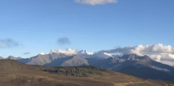 海拔5145米的俄初山在藏语里是“闪光的山”的意思。它位于亚丁自然保护区之北,处贡嘎山边缘,距日瓦乡25公里。俄初山像一位美貌仙子端坐云霓,南部为高山峡谷区,北部为俄初峡谷,撑托着地势较缓的美丽小山村,俄初山周围植被茂盛