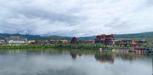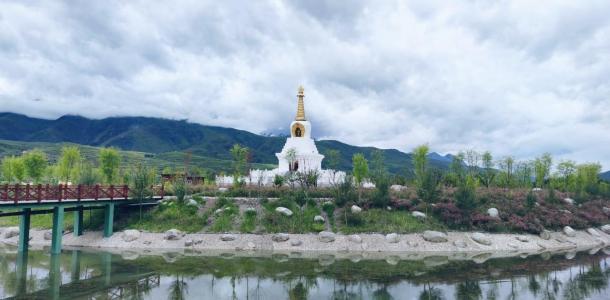 格萨尔王城的大街小巷都鲜花锦簇、红旗飘飘,漫步在珠牧圣湖的小道上,亲水空间、观景平台和慢行系统等风景优美。游客在格萨尔王城里,可远观皑皑的雪山,近赏碧水绿树、湖泊花草,鱼翔浅底,鸳鸯戏水,沁人心脾的美景十分让人沉