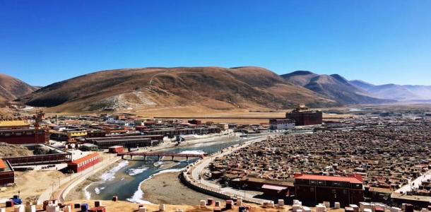 亚青寺始建于公元1985年,由大圆满成就者喇嘛阿秋仁波切住持。寺庙建在四面环山的草原湿地上,有数千间信徒居住的小木屋,纵横交错的河流包围了整个寺庙的建筑群,每当清晨或黄昏,炊烟弥漫,河水闪耀着金光,颂经声随风远远传来,