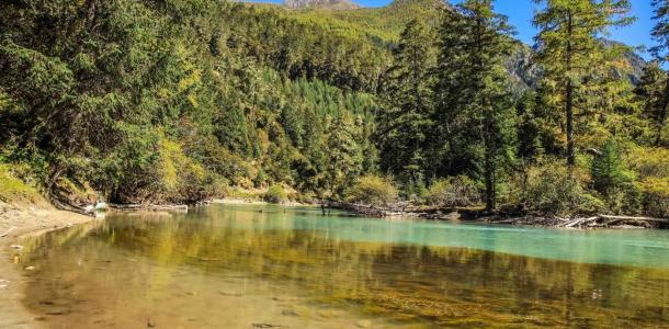 早餐后离开新都桥,前往【月亮湖】,一路都是金黄的杨树林将道路包围,这里被称为新都桥的‘十里画廊’,月亮湖因草甸和湖水吸引了无数人前来露营,月亮湖的秋天,美轮美奂,在美丽的同时又透露着与世隔绝的宁静。碧蓝的湖水荡漾在月亮湖中,与四周的金黄草甸形成了鲜明的对比。