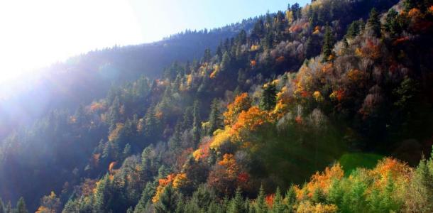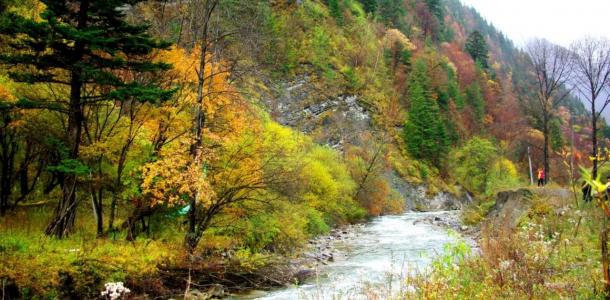 奶子沟位于黑水县至马尔康的要道旁,毗邻红原大草原,一直延伸到雅克夏雪山河谷,长达八十里的彩林世界绵延不断,因而被称作“八十里画廊”。针叶林、阔叶林、次生林、灌木丛层层覆盖了山坡,在秋天阳光的照耀下,五彩斑斓,就像