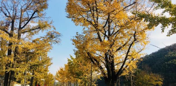 首先游览八都岕十里古银杏长廊,整个长廊长约12.5公里,宽在5公里道500米之间,长廊中散落着3万株原生野银杏,其中百年以上的老树2700多株。