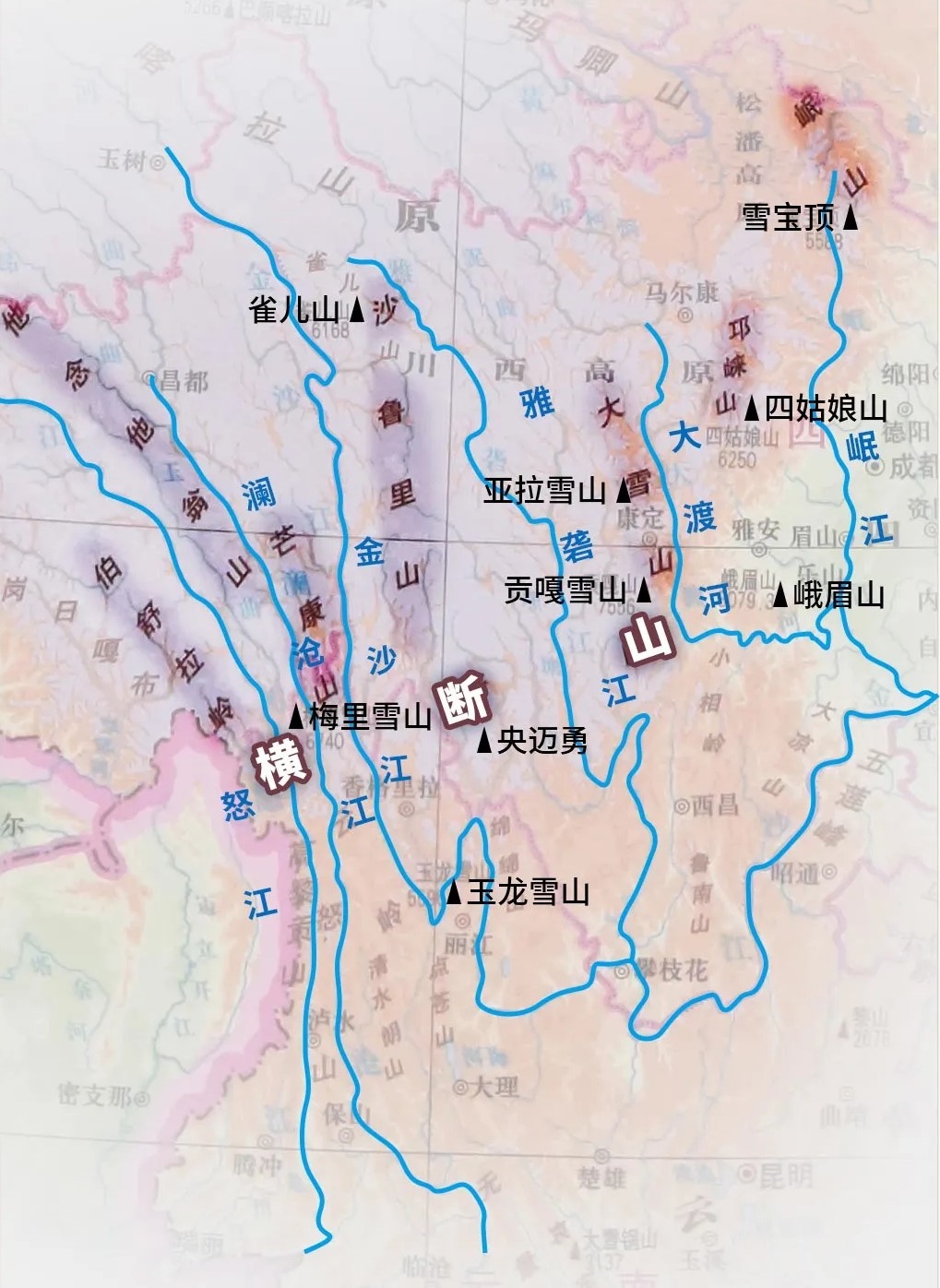 横断山是阻碍了东西交流的一片南北向群山的总称;