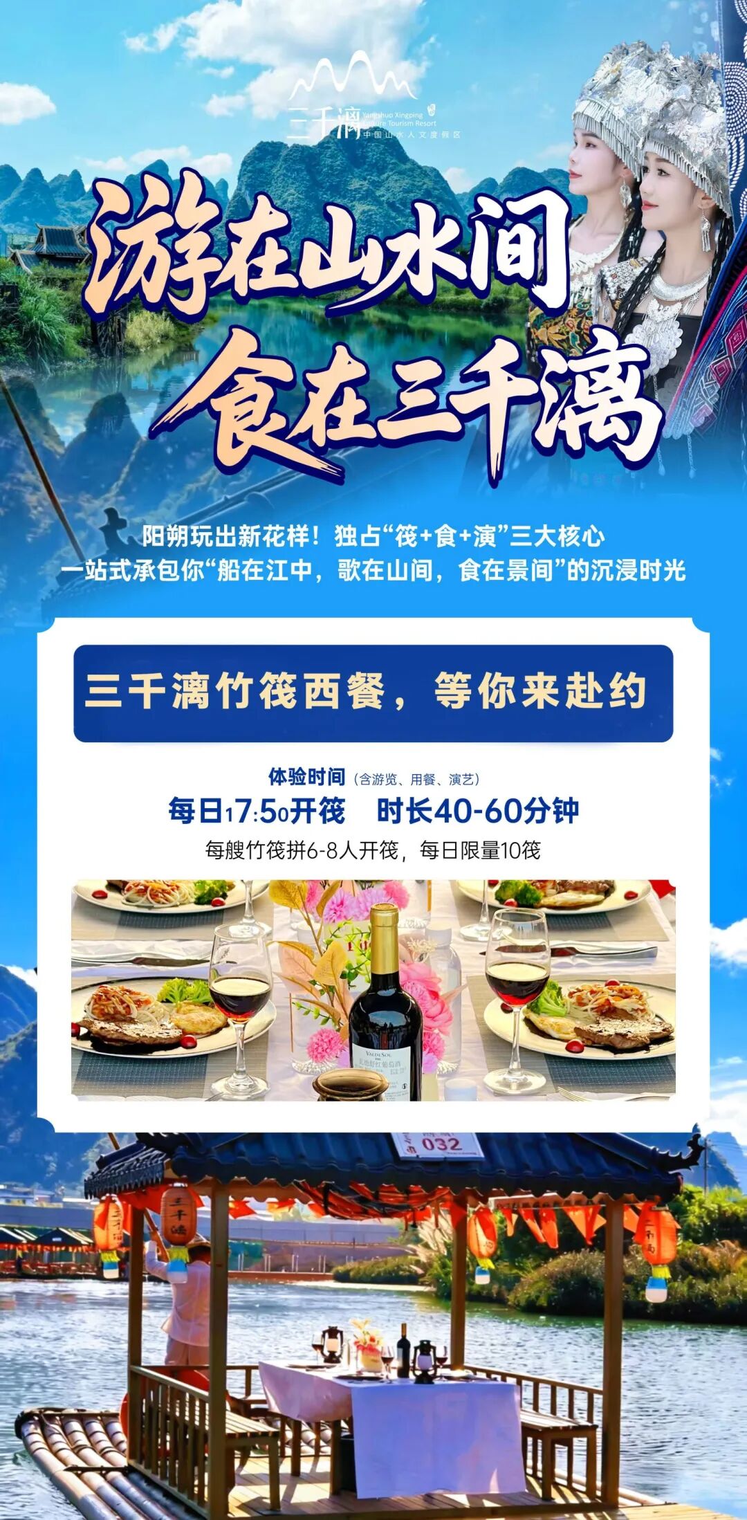 当竹筏划过碧波,当牛排邂逅漓江 —— 三千漓竹筏西餐,每一口都是山水与优雅的碰撞! 把浪漫吃进山水里!